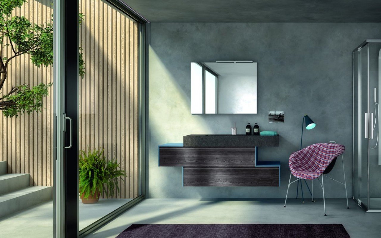 Пример оригинального контрастного решения в духе сезона-2019: мебельные фасады из натурального шпона в природном стиле в сочетании с глянцевыми торцевыми панелями ярких цветов. Еще вариант: футуристической формы душевая панель, финишированная в бардовом глянце – в контексте пола и стен, облицованных натуральным песчаником или травертином.